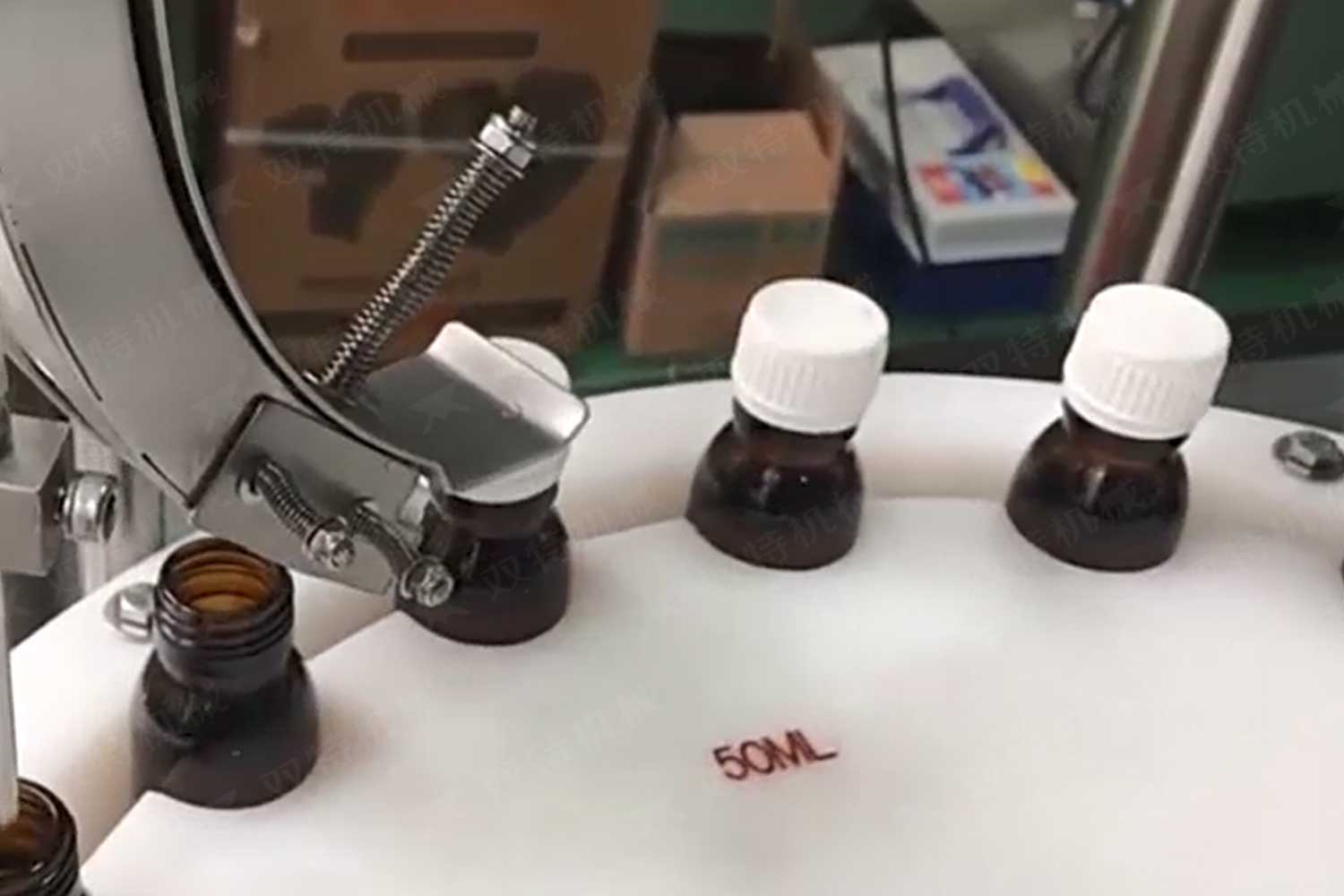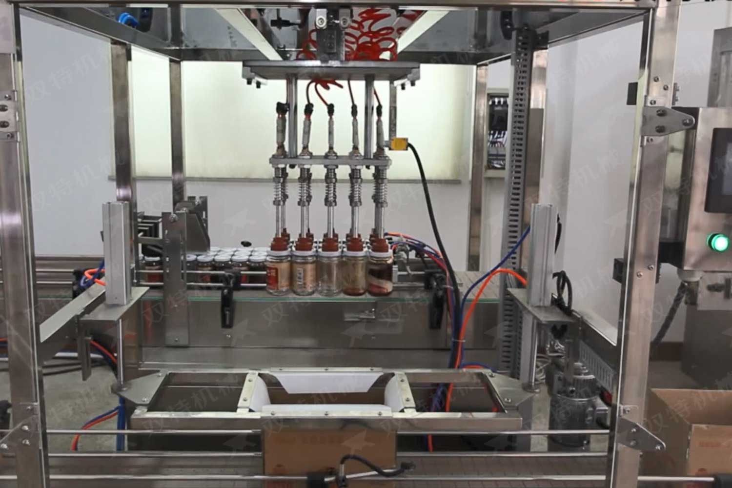 旋蓋機(jī)主要用于玻璃廣口瓶的三、四、六鐵蓋真空旋蓋,用兩根不同速度的皮帶壓瓶蓋,因兩根皮帶的速度不同,對(duì)蓋進(jìn)行搓蓋收緊達(dá)到旋蓋目的。在自動(dòng)上蓋之前對(duì)瓶口吹蒸汽加熱,吹掉冷空氣,換上高溫蒸汽,立即旋蓋,根據(jù)熱脹冷縮原理,蒸汽冷下來(lái)就自然形成了瓶?jī)?nèi)真空,達(dá)到了真空旋蓋的目的。自動(dòng)旋蓋機(jī)可以和濃醬灌裝機(jī)、蜂蜜灌裝機(jī)、辣椒醬灌裝機(jī)組合在一起,形成一套全自動(dòng)灌裝設(shè)備,是現(xiàn)代調(diào)味品企業(yè)的得力幫手。